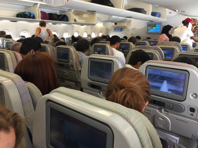 Teníamos todos los vuelos de larga distancia con la compañía Emirates, volando con el enorme con el A380 de dos pisos, un espectacular avión, comodísimo, en el que apenas se notan los movimientos, ni el ruido, una maravilla vaya, vale la pena invertir un poco más para volar en el A380, el espacio de las piernas es más amplio que en otras compañías y la comida, sin ser espectacular, está muy correcta. Salimos de Barcelona realizando una pequeña escala obligatoria en Dubái.
