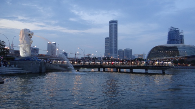 Después nos dirigimos al Merlion Park pasando por los edificios emblemáticos que comenzaban a iluminarse, ayuntamiento, museos, etc., tras cruzar varios puentes iluminados con vivos colores, llegamos al Merlion donde nos hicimos las típicas fotos simulando que nos tragamos el agua que sale de la boca del león con cuerpo de pez, por algo somos turistas no?.