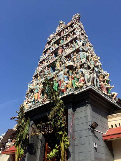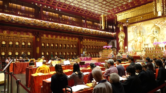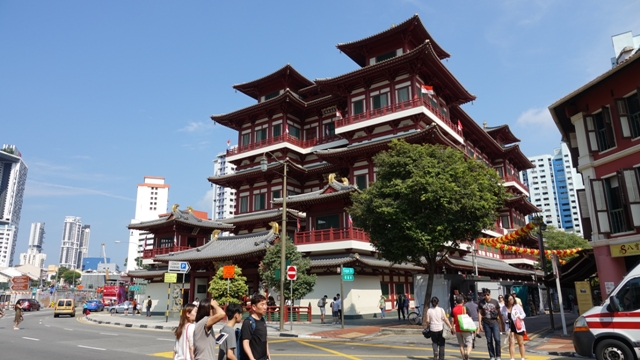 Siguiendo la calle te encuentras con el templo indú Sri Mariammam, que visitamos, te hacen pagar un pequeño canon para poder hacer fotos, es como estar en la India, pero con todo más limpio, mientras lo visitas ellos van haciendo sus ceremonias hindúes, al salir cogimos la South Bridge Road a la derecha para llegar al Templo del Diente del Buda, en él dicen que se encuentra uno de los cuatro dientes que sus discípulos recuperaron de las cenizas después de su cremación, en ese momento estaban haciendo una ceremonia orando una lectura de un libro, fue muy emotivo; el templo por dentro es espectacular.