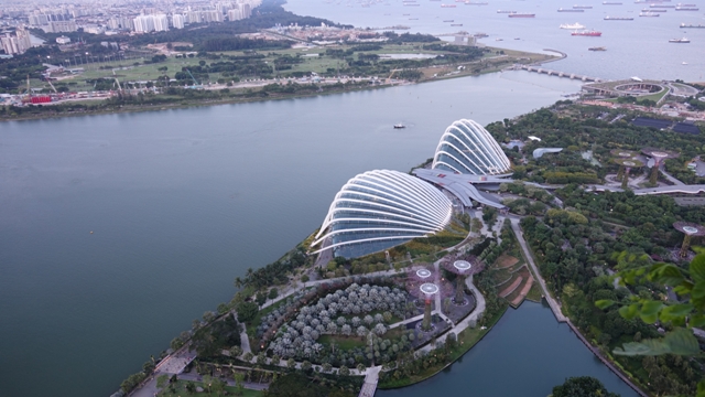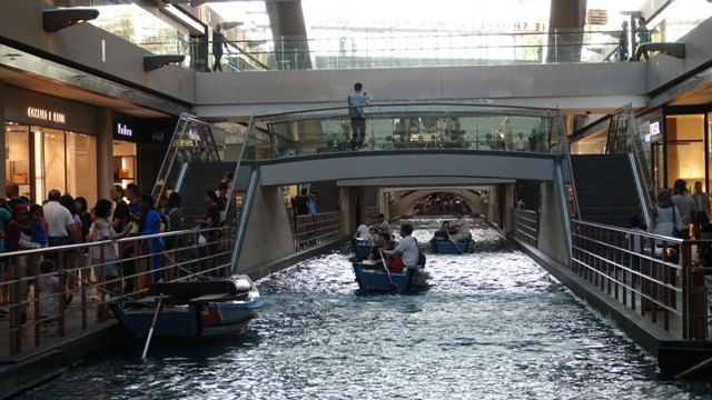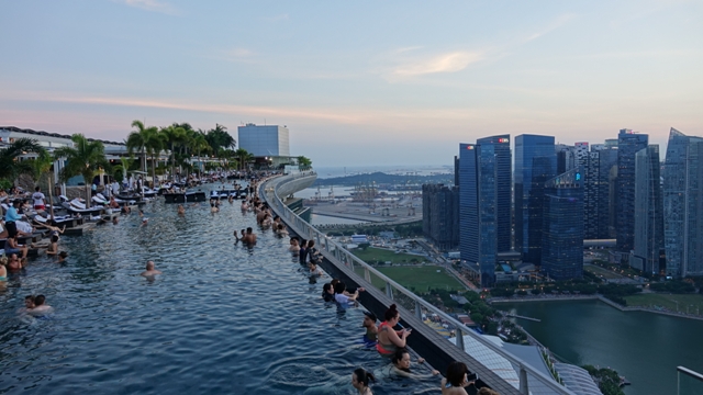 Para terminar este día tan intenso, nos dirigimos en metro hasta el Marina Bay Sands, con sus tres famosas torres y encima de ellas la gran terraza con la piscina desbordante. Una vez entramos en el centro comercial, nos sorprendió ver que tienen un canal con góndolas como en el Hotel «The Venetian» de las Vegas, tras caminar un buen rato y preguntar varias veces, por fin encontramos la entrada del Bar CÉ LA VI, donde leímos, que con la entrada de 20 $ con consumición incluida, subes al piso 57 y tienes las magnificas vistas de la ciudad, justo al lado de la piscina, la verdad es que las vistas desde arriba son espectaculares, lástima que hay bastante gente y si no te das prisa hay pocos sitios para sentarse, el mejor sitio es la zona justo al lado de la piscina desbordante, donde hay una pequeña pista de baile.