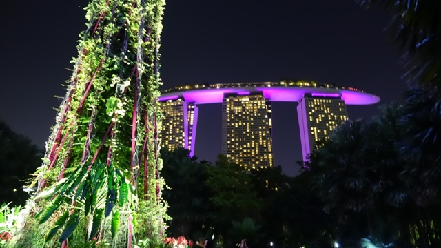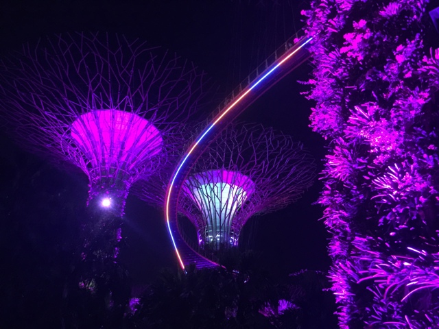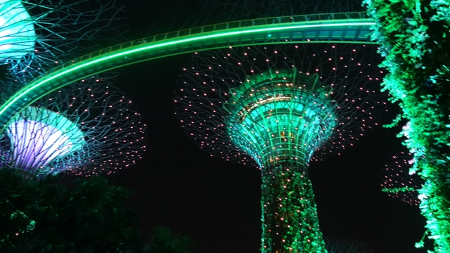Después de ver la puesta de sol, la ciudad se va iluminando poco a poco y va cambiando su aspecto, cuando es completamente de noche lanzan los fuegos de artificio para rematar el espectáculo, una vez terminado, bajamos a los Gardens by the bay para ver el show nocturno, de los gigantescos árboles artificiales repletos de luces, nos tumbamos en el suelo y nos dispusimos a disfrutar del espectáculo, una pasada, la verdad es que tenía muchas ganas de verlo, es gratuito , los horarios son a las 19:45 y a las 20:45.