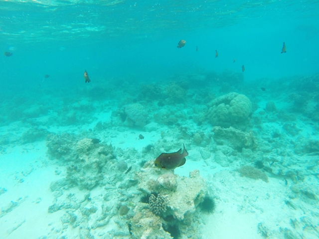 Este día habíamos contratado la visita al atolón Mnemba, con snorquel incluido en sus aguas cristalinas, desayunamos y nos fuimos hasta la playa a la hora concertada para que nos recogieran las dos lanchas, una media hora tarde llego el boy con una sola lancha para ir al atolón, la organización es a lo compadre, durante el trayecto nos acompañaron un rato unos delfines haciéndonos disfrutar más del trayecto, como era la hora de marea baja tuvimos que dar un poco más de rodeo, pero como íbamos bastante rápido no hubo problema, llegamos al atolón, que no se puede pisar porque es privado, cosa que fastidio un poco a mi mujer pues ella desde la barca no le gusta tirarse al mar, hicimos más de una hora de esnorquel viendo miles de peces de colores, erizos, estrellas de mar, etc.., todo precioso.