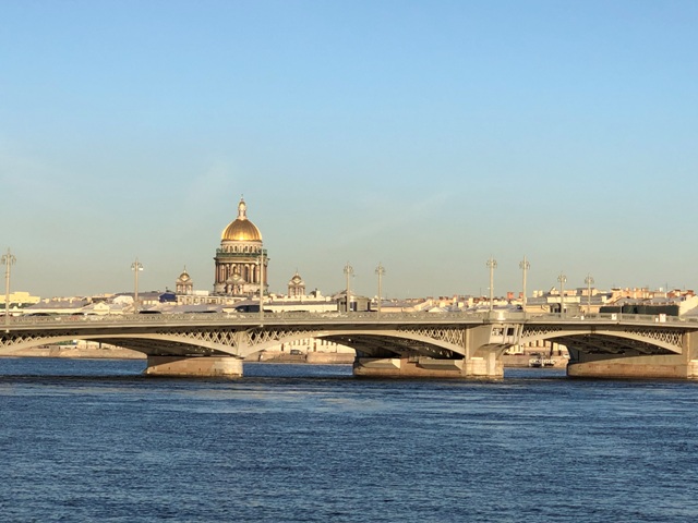 Iniciamos el recorrido por la avenida Leytenanta Shmidta embankment que transcurre por la orilla de río Néva, como íbamos por la acera que estaba justo al lado del río nos encontramos con el primer puente, al no encontrar un paso de peatones cercano, teníamos que retroceder un buen trozo para encontrar el semáforo, así que decidimos cruzar el puente y así íbamos viendo los magníficos edificios de la otra orilla, ciertamente en ambos lados del caudaloso río está lleno de preciosos palacetes.