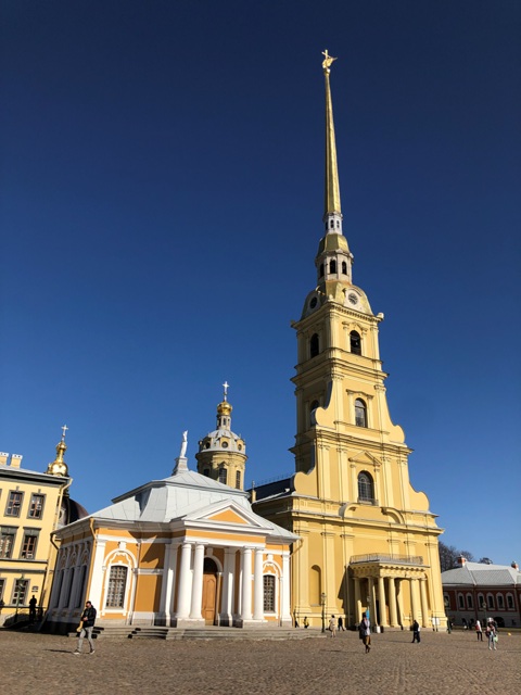En la fortaleza una vez cruzado el arco de entrada, iniciamos la visita en la plaza central totalmente adoquinada, con los majestuosos edificios a su alrededor y con el dorado tejado de la catedral acabado e una enorme aguja de 123 metros de altura. La fortaleza era la ciudadela antigua de San Petersburgo.