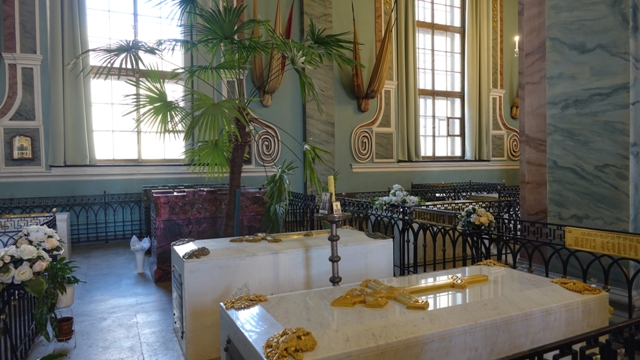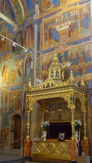 Pasamos al interior de la catedral, decorada con unas preciosas lamparas y paneles forrados con pan de oro, en la catedral descansan los restos de la mayoría de los emperadores y emperatrices rusos desde Pedro el Grande hasta Nicolás II, (que es el último zar ruso que fue ejecutado junto con su mujer e hijos durante la revolución de 1917).