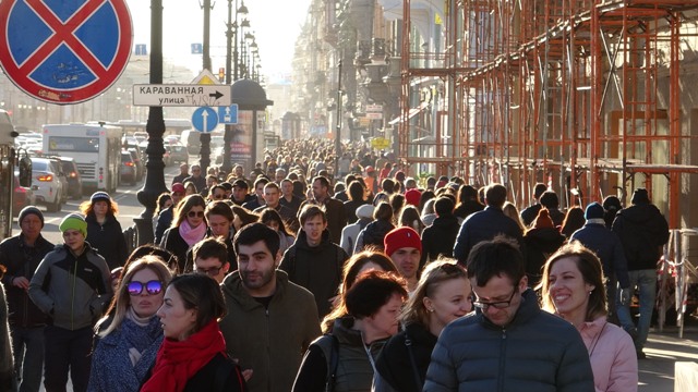Al salir del museo, que está situado frente al río Fontanka, habían la paradas de los barcos para los tours por los canales, pero en nuestro caso preferimos pasear por la ciudad a pie, así que tomamos la enorme avenida Nevsky, famosa por ser el eje comercial más importante de San Petersburgo, como eran las seis de la tarde coincidió con la salida del trabajo de la mayoría de ciudadanos, por lo que estaba la avenida abarrotada de gente.