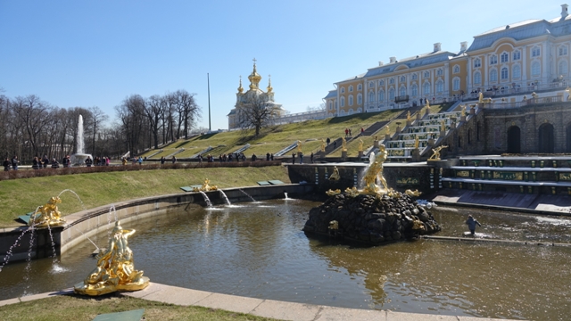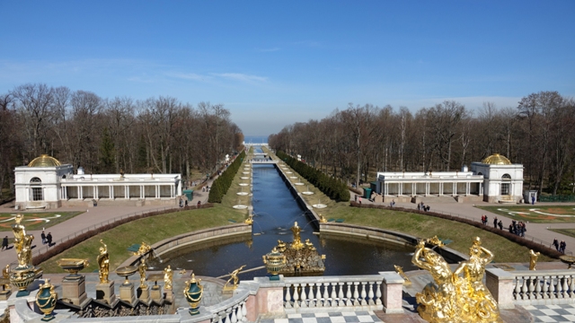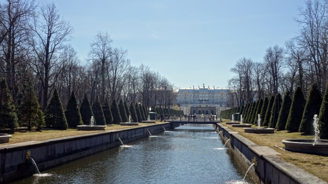 Los jardines están situados frente al golfo de Finlandia, en ellos hay varias fuentes con multitud de figuras doradas y un canal central que desemboca en el mar, el cual recorrimos por la orilla hasta la desembocadura y regresamos por el otro lado.