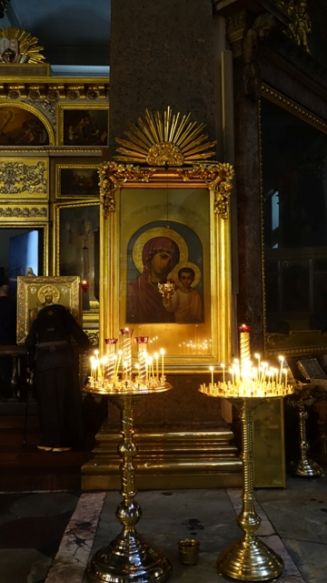 Nos acercamos paseando a la Catedral de Kazán, la principal del la ciudad, que ya habíamos visto por fuera, destaca su gran columnata compuesta de 96 columnas, así que visitamos también su interior, la entrada es gratuita, su decoración es en mármol de color verde oscuro, con columnas grises, en su parte principal se encuentra el milagroso icono de Nuestra señora de Kazán.