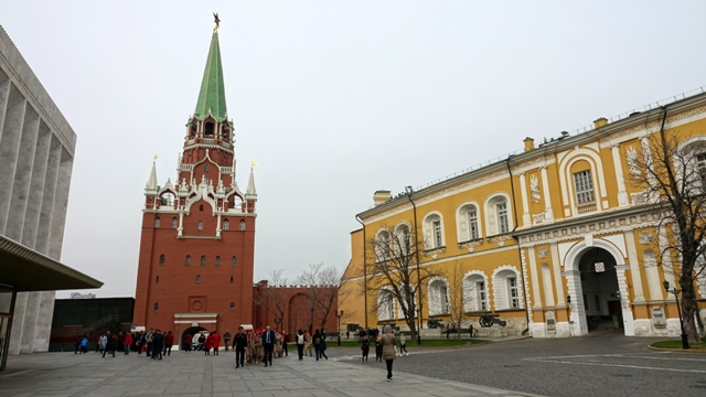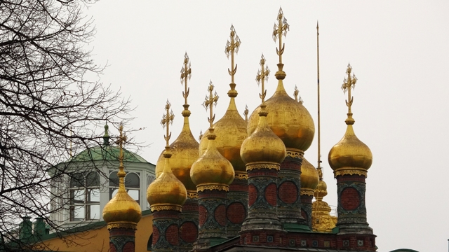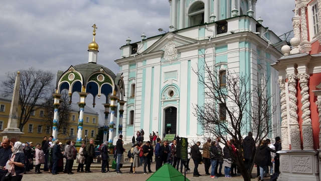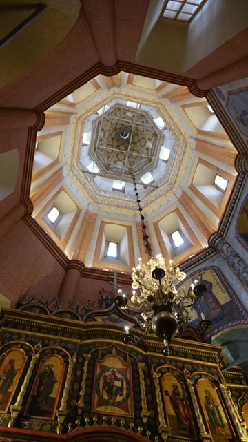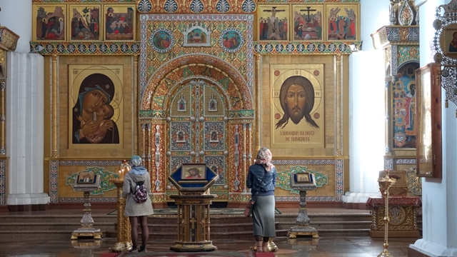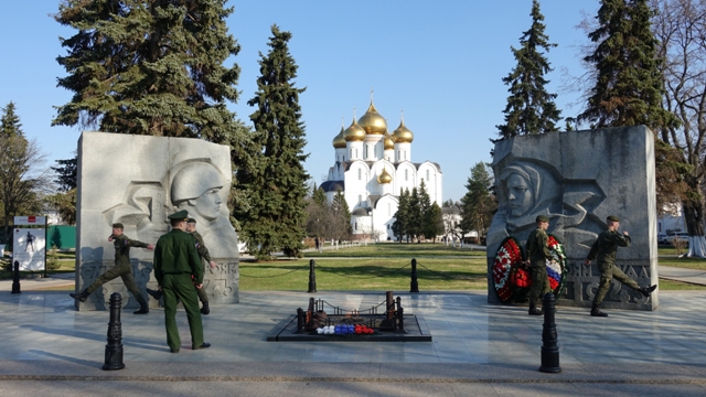 Paseamos por la avenida Demidovskiy Skver hasta llegar a el monumento de la Llama eterna en honor a los caídos en la guerra, situada frente a la Catedral de la Asunción o Uspenskiy Kafedral’nyy Sobor, reconstruida después que la dinamitaran los soviets, con sus cúpulas doradas, que a diferencia de las más antiguas no están forradas en pan de oro , si no de un material moderno que es una especie de aleación de titanio. Su interior, tal como nos tienen acostumbrados en este país, esta repleta de iconos y retablos dorados, con sus fieles rezando frente a las doradas puertas tras las que se esconde el altar.