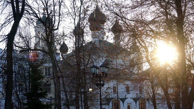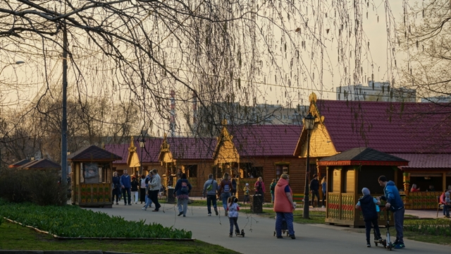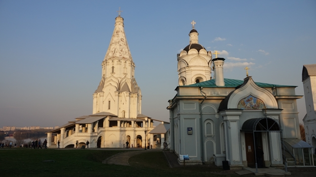 Paseamos tranquilamente por el parque situado a orillas del río Moscova, hasta llegar a la Iglesia de la Ascensión del Señor, seguimos el paseo hasta el Museo de Arquitectura de Madera, una zona muy agradable y relajante frente a un lago creado por un ensanchamiento del río Moscova que coincidió con la puesta de sol.