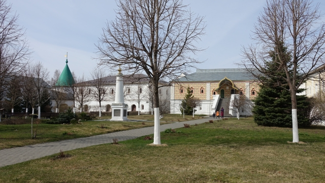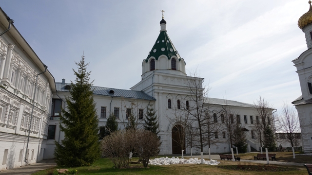 Una vez en Kostromá iniciamos las visitas con el Monasterio de Ipatieavsky, fundado en 1330 por el príncipe Zajari Chet, a orillas del río Kostromá, es como un recinto amurallado. Al entrar en el monasterio le hicieron poner a mi esposa un pañuelo en la cabeza y una falda encima de los tejanos, un poco raro ya que al ir con pantalón largo no se el porque de la falda, una vez dentro, visitamos la iglesia, el museo e hicimos un paseo por el patio.