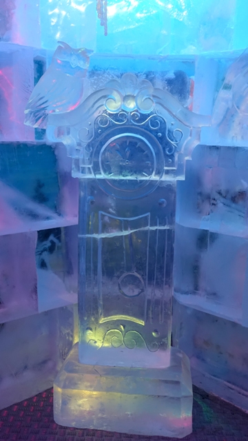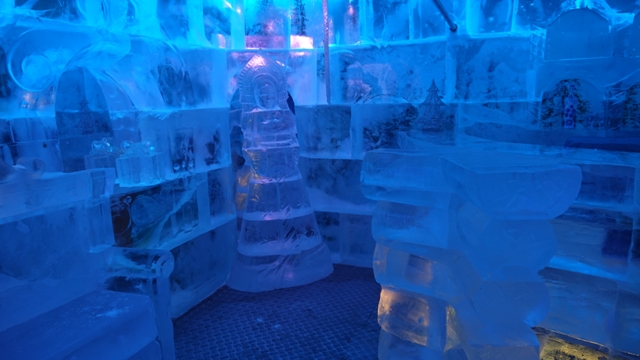 Para comer nos ofrecieron, como de costumbre comida tradicional rusa. En el jardín estaba la casa de madera donde vive la nieta, la tal Snegurochka, al entrar nos dieron unos abrigos y entramos en la sala donde vive completamente rodeada de hielo a -15 grados centigrados, bebimos unos chupitos en vasos de hielo e hicimos las fotos y vídeo pertinentes, una visita divertida.