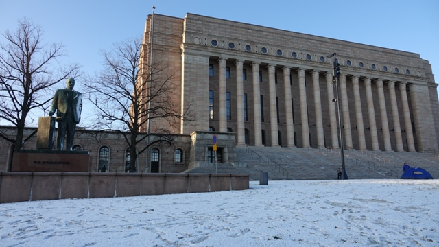 Bajamos hasta el parlamento o Eduskuntatalo, un edificio cuadrado con inmensas columnas en su fachada, frente a este hay varios edificios de reciente construcción, el museo de Arte Contemporáneo o Kiasma, la biblioteca central o Oodi , inaugurada a finales de 2018 y el Centro de Música.