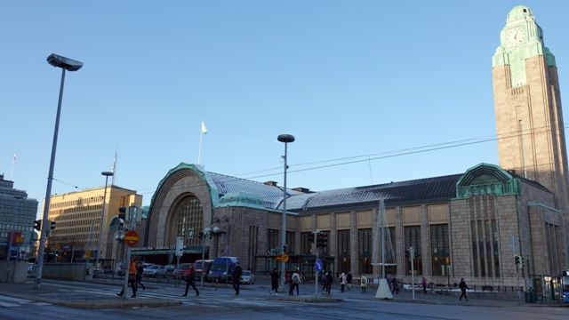 Ya que estábamos muy cerca, hicimos una pequeña parada técnica en hotel, para a continuación seguir con las visitas de la ciudad, una vez en marcha, pasamos otra vez frente a la Estación Central llamada también Rautatientori. donde hicimos unas fotografías de su fachada de estilo «art noveau», aunque ya la  habíamos visitado de noche aprovechamos para verla de día.  Al lado de esta nos encontramos con el memorial de Alexis kivi y la pista de hielo frente al casino de Helsinki.