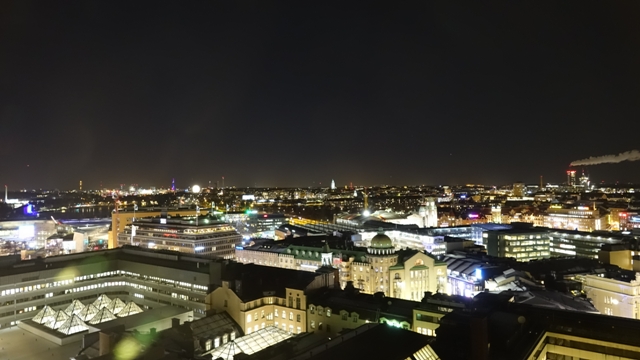 La zona visitable de Helsinki es relativamente pequeña, unos tres kilómetros de un extremo a otro como mucho, hicimos algunas fotografías y vídeos de sus calles y edificios con las luces navideñas, paseamos frente a la estación central, atravesando el paseo llamado esplanadi hasta llegar al puerto donde está el antiguo mercado, de allí regresamos pasando frente la catedral. Para cenar decimos ir a un Vapiano, que está en la calle Mikonkatu, 15, aunque eran desesperadamente lentos. Una vez conseguimos cenar regresamos al hotel.