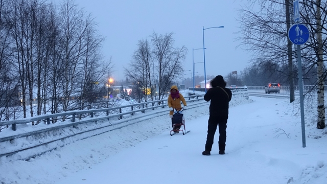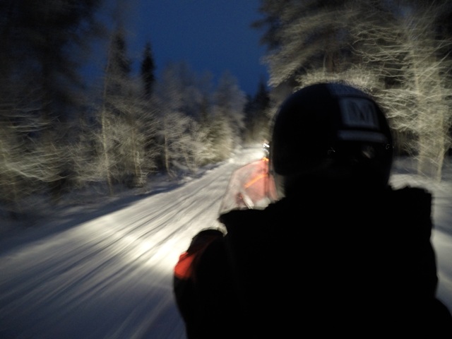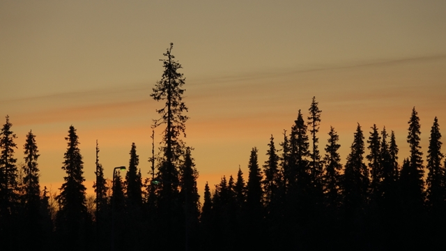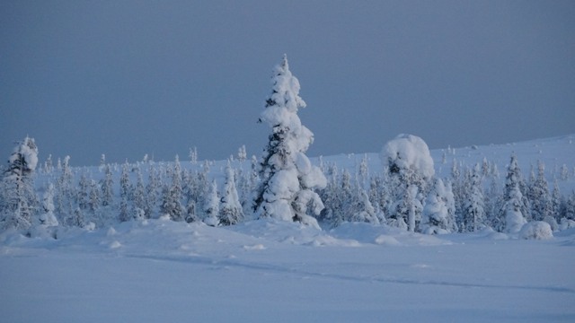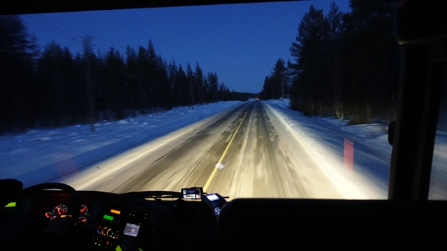 Estábamos ya en la zona donde durante esta época nunca acaba de salir el sol, llamada noche polar o Kaamos, en diciembre, en teoría, “sale el sol” a las dos de la madrugada y se pone a las 12 de la noche, la realidad es que el sol nunca supera el horizonte, quedando todo durante horas de un tono azulado, pero a partir de las tres de la tarde ya está todo muy oscuro.
