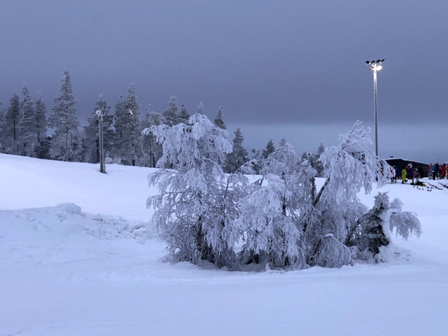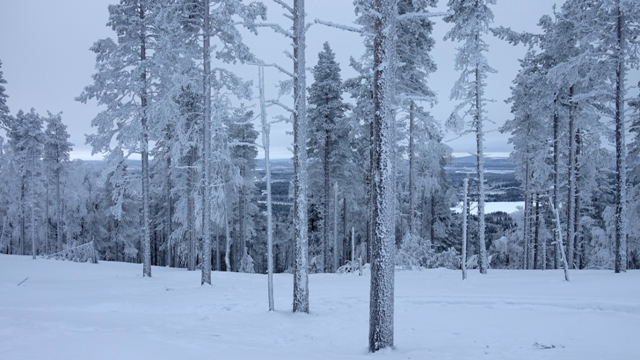 A las 9:30h. salimos dirección a Inari para visitarlo, está a unos 70 kilómetros desde Saariselkä, una hora aproximadamente en coche, hicimos una primera parada a mitad de camino antes de llegar a Ivalo en una colina con abetos helados.