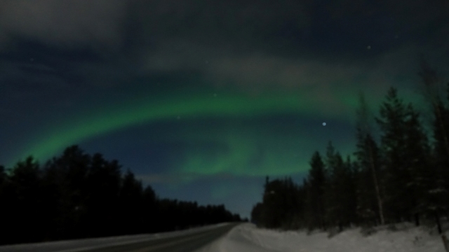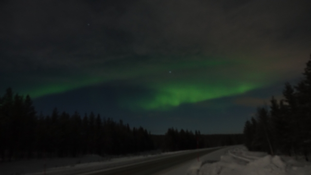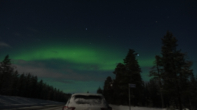Cuando llevábamos unos quince minutos de ruta empezamos a ver una especie de nubes de color verdoso, paramos el coche en una parada de bus, hay muy pocas zonas donde detenerse en estas carreteras en invierno, ya que el quitanieves hace un escalón alto en los arcenes y es imposible pararse allí, además por la noche pasan camiones con remolque a mucha velocidad y es peligroso detenerse en mitad de carretera.