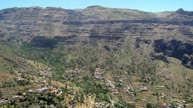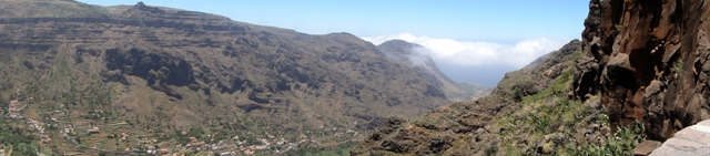 Desde el mirador de la punta disfrutamos de unas preciosas vistas del valle de Hemigua, repleto de plantaciones de plataneras cultivadas en bancales desembocando en una playa de guijarros negros, creando un bonito contraste con la espuma de las olas.