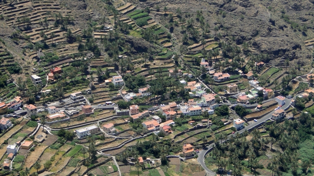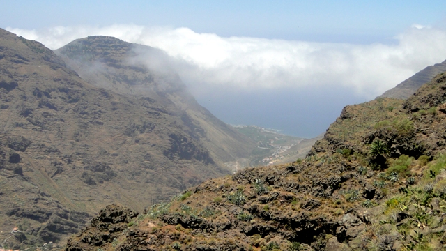 Al llegar al otro extremo del parque en el Valle Gran Rey, desapareció el bosque volviéndose el terreno más seco con abundantes cactus a orillas de la carretera.