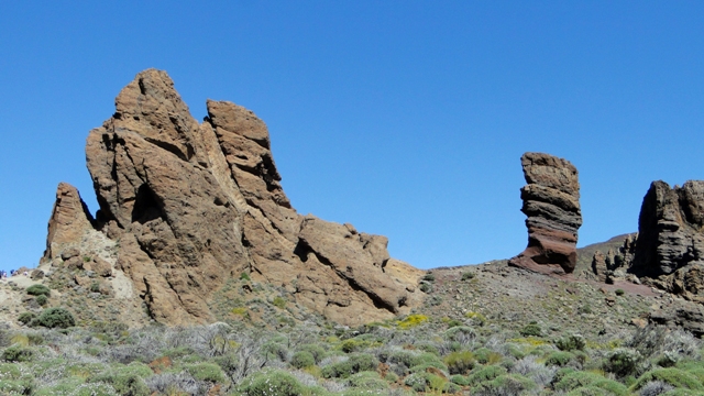 Una vez superado el centro de visitantes del Portillo entramos dentro del parque, al cabo de apenas un kilómetro nos encontramos con las cañadas del Teide, una inmensa caldera de unos dieciséis kilómetros de diámetro donde se han depositado las lavas de diferentes erupciones formado un espectacular paisaje, uno de los lugares más visitados son Los Roques de García, con sus singulares formaciones rocosas, destacando la del Roque Cinchado, que los más mayores lo recordaremos porque salia su imagen en el reverso de los billetes de mil pesetas con el pico del Teide de fondo.