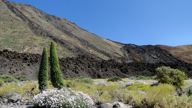 La ventaja de viajar a finales de Junio fue que todavía habian muchas flores en las zonas aledañas a la lava quedando unas imágenes preciosas, pudimos ver varios Tajinastes rojos de casi dos metros de altura, aunque en nuestro caso eran verdes.