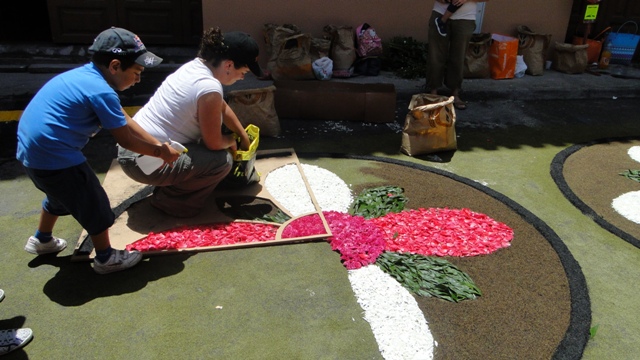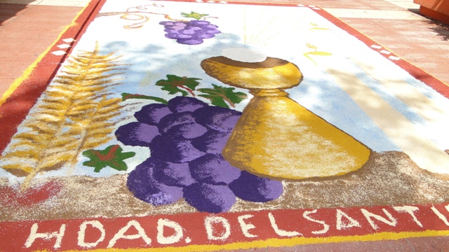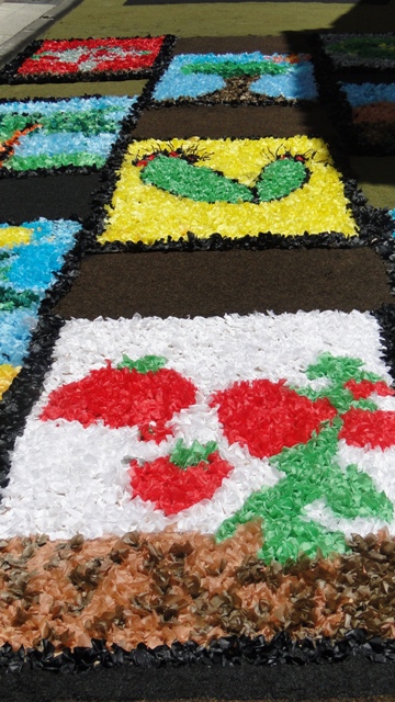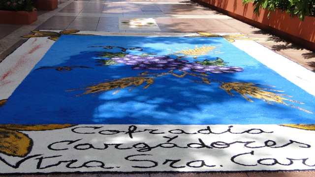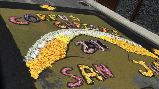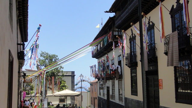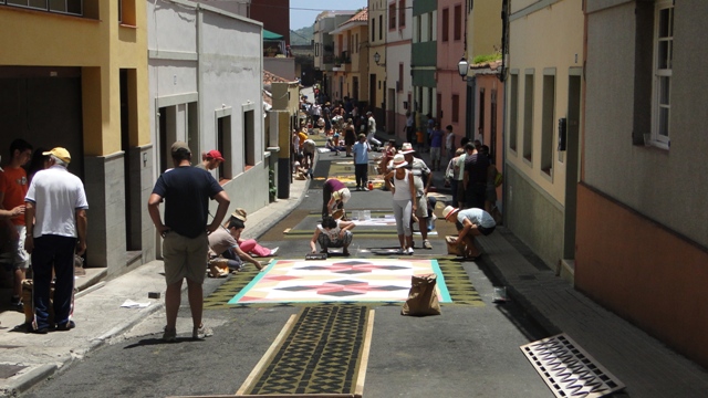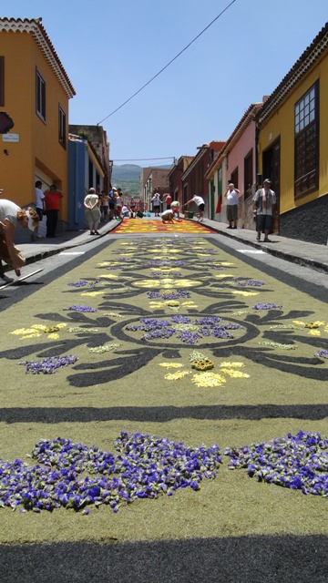 Al descender del parque nacional del Teide nos dirigimos a la Villa de la Orotava para visitarla, con sus empinadas calles que destilan un encanto especial, en esta ocasión nos coincidió con la celebración del Corpus Christi, día en que estaban haciendo sus famosas alfombras florales combinadas con arenas naturales en las calles del centro histórico, estando muchos de sus habitantes atareados en ello.