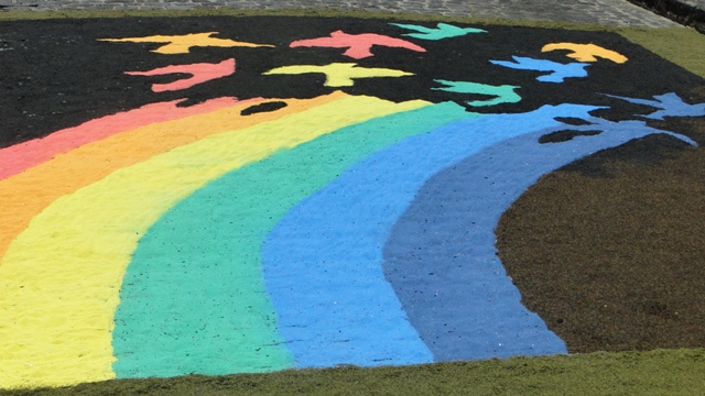 Visitamos la población de Agulo, que es la más cercana al mirador, nos coincidió con alguna celebración, supongo que era el Corpus, ya que encontramos a varios lugareños haciendo alfombras de arena de colores en medio de las calles. Seguimos con nuestro relajante paseo por la localidad viendo su ayuntamiento, la iglesia y las casas coloreadas.
