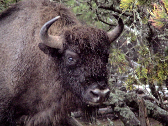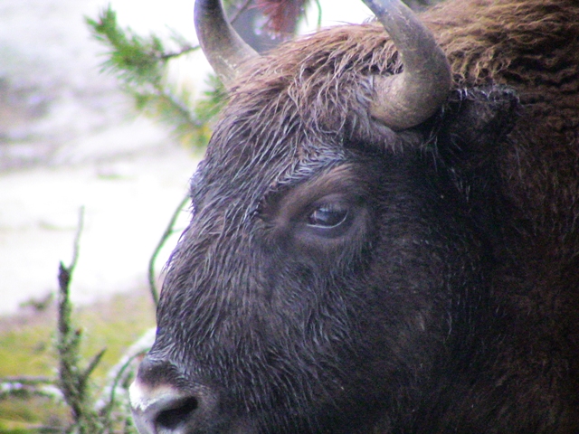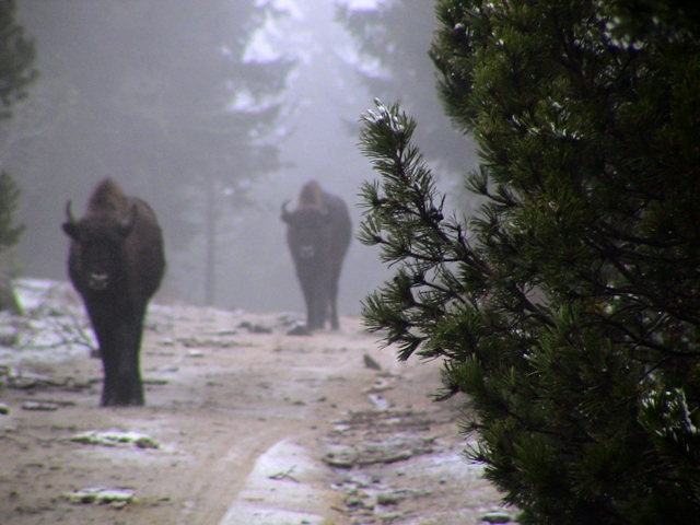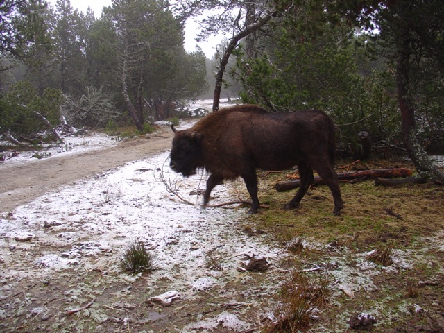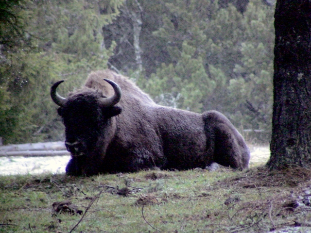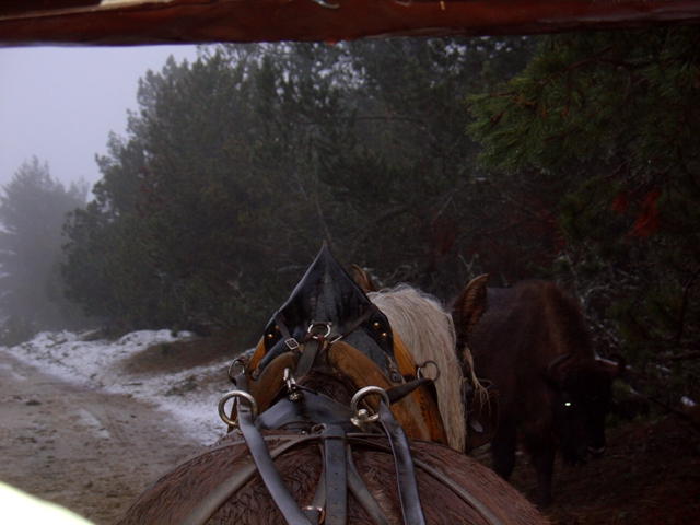 La visita la realizamos en un carruaje de seis plazas junto con una familia italiana, una vez sentados, nos dieron unas mantas para taparnos la piernas pues volvía a refrescar bastante, el recorrido se hace a través de un bosque y tiene una hora de duración, mientras íbamos observando el ir y venir de los bisontes bajo la nieve que volvía a caer, parecía que no hubiésemos teletransportado a otra época y otro continente.