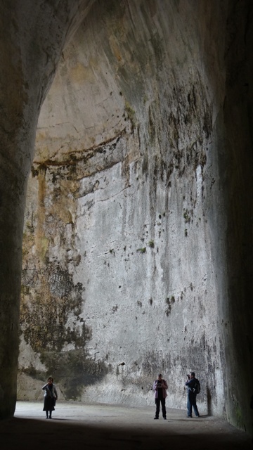 En la parte más baja paseamos por el parque en la zona de la Latomía di Paradiso, con estrechos senderos rodeados de vegetación que no llevaron hasta la “la oreja de Dionisio”, un cueva de altos techos, donde el famoso tirano de Siracusa Dionisio encerraba a los prisioneros atenienses, la cueva dispone de una acústica sorprendente.