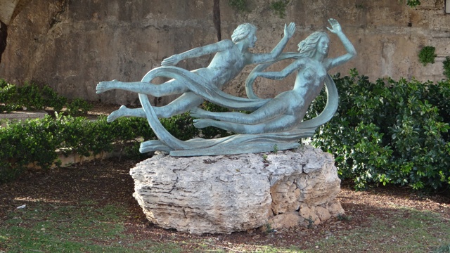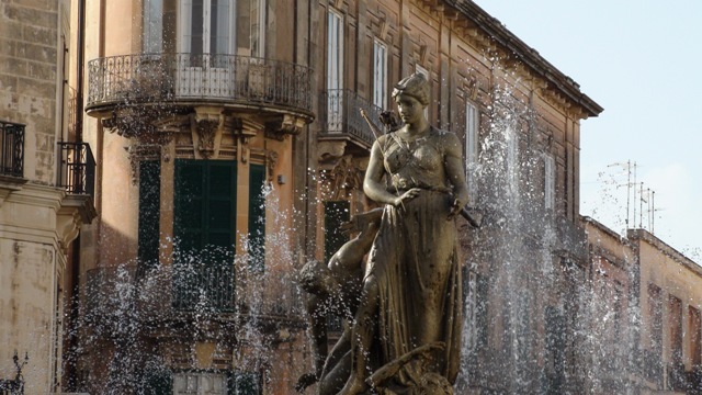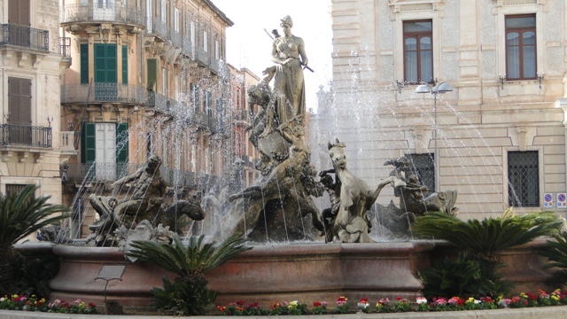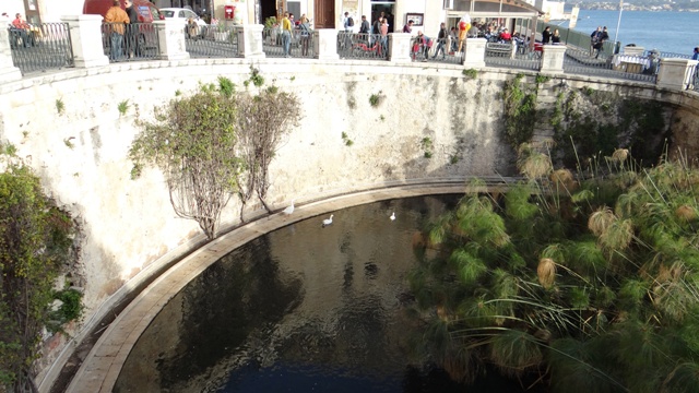 La siguiente visita fue la «Fonte Aretusa«, una preciosa fuente de agua dulce dedicada a la ninfa Aretusa a la que la diosa Artemisa convirtió en fuente, donde los patos nadan a sus anchas. Está situada justo al lado del bastión, desde donde pudimos disfrutar de unas fantásticas vistas al puerto al sol del atardecer.