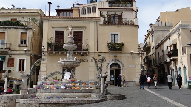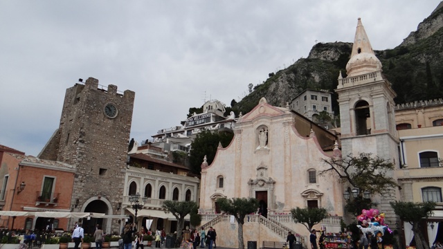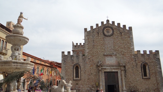 La visita de la población está concentrada especialmente en su calle principal la llamada «Corso Umberto«, donde se aglutinan varios de los edificios más representativos de Taormina, además de gran variedad de tiendas y restaurantes, iniciamos nuestro paseo entrando por la «Porta Messina«, recorriendo la calle pasando frente al palacio Corvaja hasta la «Piazza IX Aprile» frente a la cual nos encontramos con la iglesia de San Agostino y la iglesia de San Giuseppe, con unas maravillosas vistas de la costa con el Monte Etna de fondo, un lugar característico donde fotografiarnos todos los turistas.