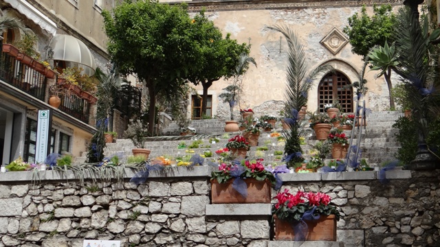 Descansamos a la sombra de los arboles en la Terraza Panorámica del «Giardini Naxos» admirando las vistas, para luego regresar por la calle Umberto, descubriendo nuevos detalles que se nos habian pasado inadvertidos a la ida.