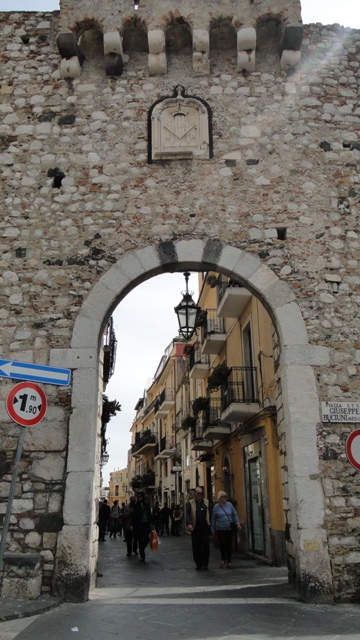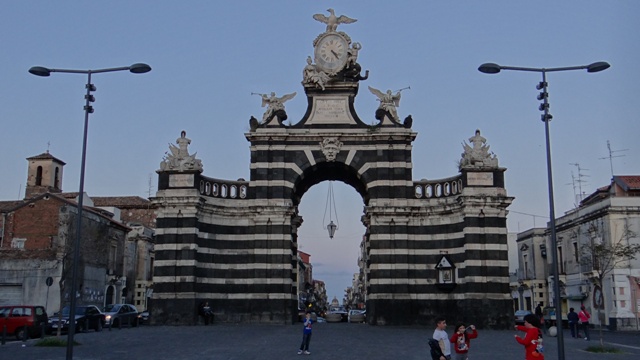 Subimos por toda la Via Giuseppe Garibaldi hasta llegar a la Porta Ferdinandea, también llamada Porta di Garibaldi, pasamos frente a la iglesia del «Santissimo Crocifisso Majorana», la iglesia de Santa Chiara y la casa de Giovanni Verga.