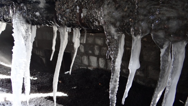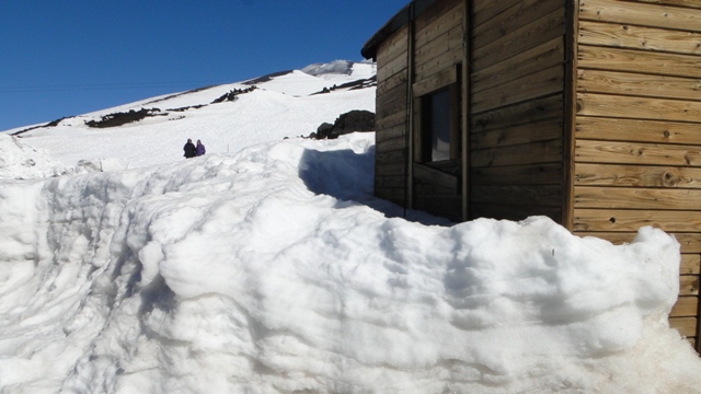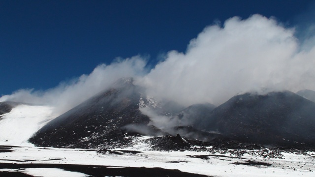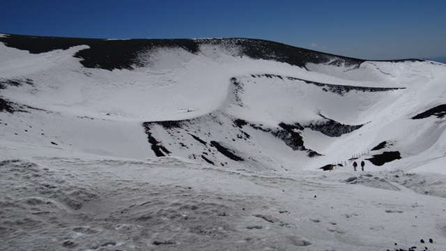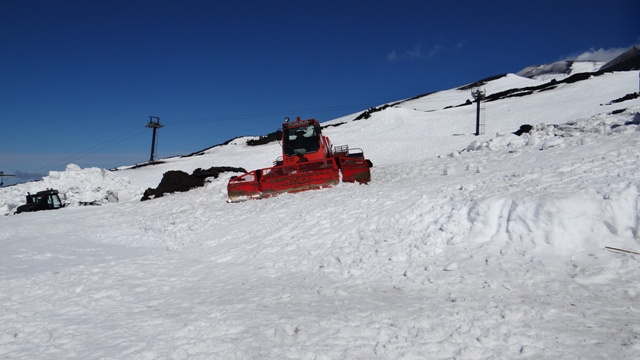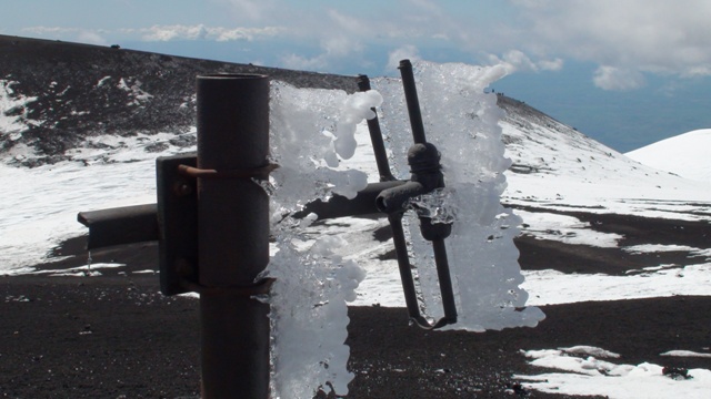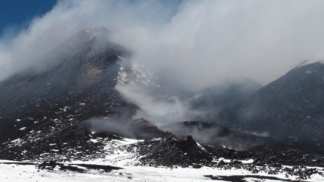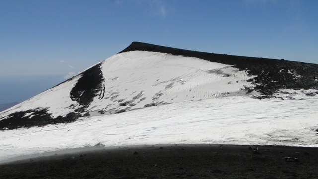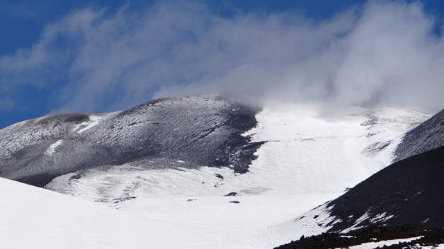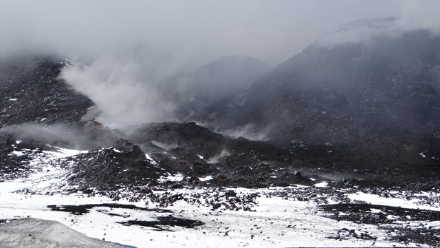 Hicimos el recorrido a pie de los varios puntos de interés que nos recomendaron, varias fumarolas, una pequeña cueva de hielo, pequeños conos volcánicos y un corto recorrido por la ladera, los paisajes eran preciosos sobretodo el contraste de la nieve con la negra lava, pero sinceramente con el frío que teníamos tampoco nos apeteció prolongar mucho tiempo más la estancia en la cumbre, así que subimos otra vez al camión para emprender el regreso al refugio donde teníamos el coche aparcado.