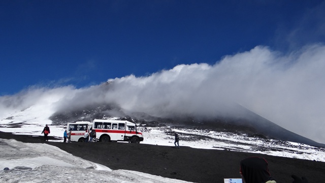 En aproximadamente una hora llegamos al «Rifugio Sapienza» a 2000 metros de altura, donde se encuentra el aparcamiento y la estación del funicular llamado «Funivia dell’Etna«, tal como íbamos subiendo la vegetación desaparecía convirtiéndose en grandes mares de lava volcánica solidificada.