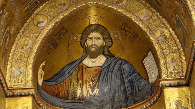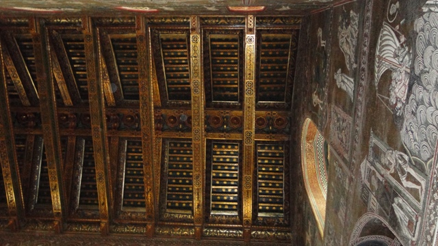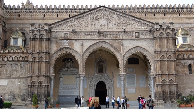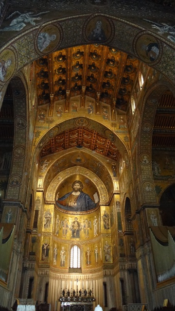 A pesar de que el tamaño de la catedral no es demasiado grande comparada con las otras que hemos visto en Sicilia, destacan unas bonitas decoraciones de arte fatimí en su fachada oeste, pero lo mejor lo encontramos una vez entramos a su interior, nos quedamos asombrados al ver la nave central, con unos maravillosos mosaicos que llegan hasta el techo, que según he leído, están realizados con mas de dos mil kilos de pan de oro.