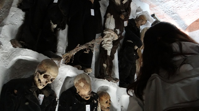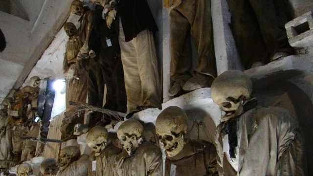 Nuestra primera visita en Palermo fueron las Catacumbas de los Capuchinos, un paseo algo macabro por unas catacumbas ceremoniales donde al bajar un tramo de escaleras nos encontramos con seis cámaras subterráneas que contenían una gran cantidad de momias colgadas de sus paredes, nada más y nada menos que 850 momias y cerca de 8000 cadáveres, divididos según su edad, sexo o actividad: sacerdotes, niños, hombres, mujeres, frailes, profesiones, etc.