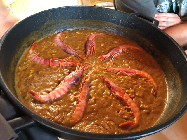 En cuanto a la presentación de los platos es correcta, sin grandes florituras, en esta ocasión elegimos comer de la carta, unas ensaladas de entrante, con una paella de arroz meloso de gamba roja y de postre piña a la plancha con crema pastelera con café, todo estaba delicioso. También había disponible un menú de 35€ bastante interesante, pero como en los entrantes había mejillones y tataki de pez espada que a mi no me gusta no lo elegimos .