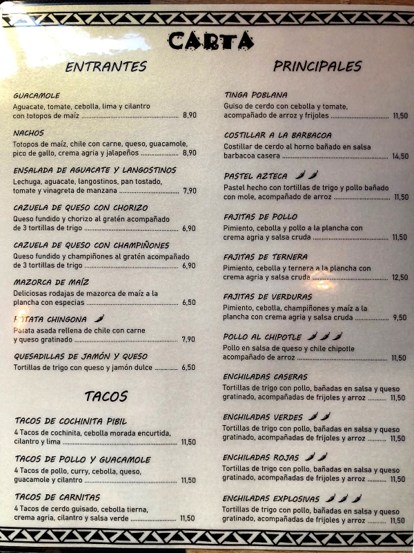 La carta, como es lógico, está integrada completamente por los típicos platos mexicanos, acompañada de una buena variedad de cervezas del país.