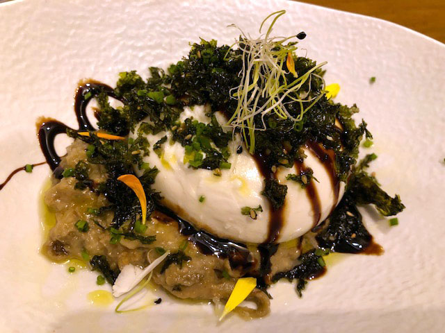 En nuestro caso elegimos de entrantes los huevos rotos con bogavante y suquet, la burrata a la baba ganoush con crujiente de algas y sesámo y el canelón de verduras con hummus de olivada negra y su crema de leche de soja, almendras y aguacate .