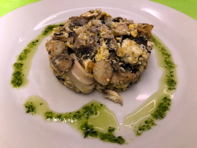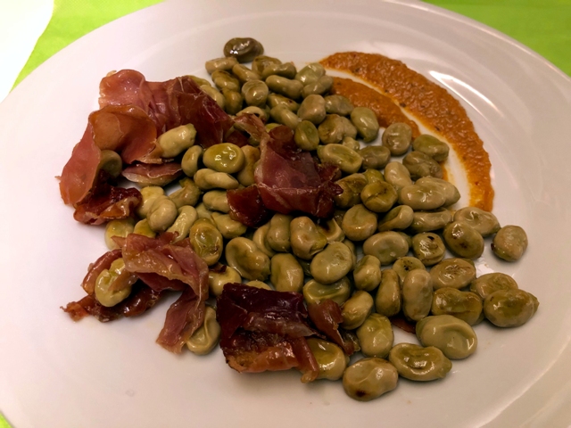 Para esta ocasión nos decidimos por el menú de Domingo, eligiendo de entrantes unas deliciosas habitas baby con jamón en salsa romesco y el revuelto de champiñones con chipirones de playa.