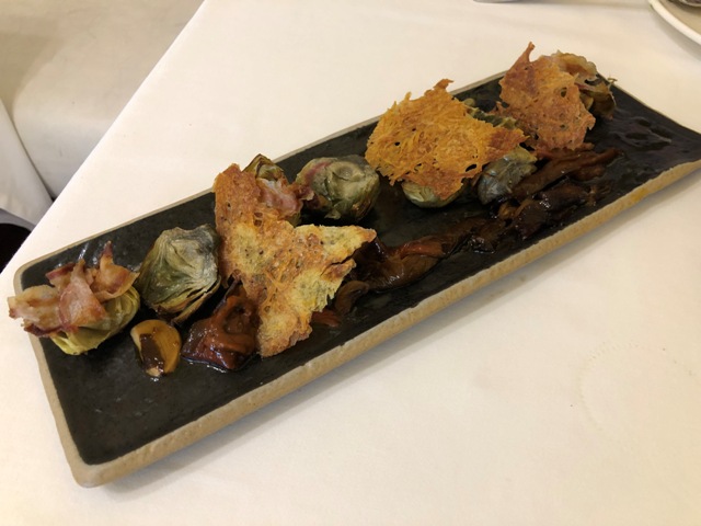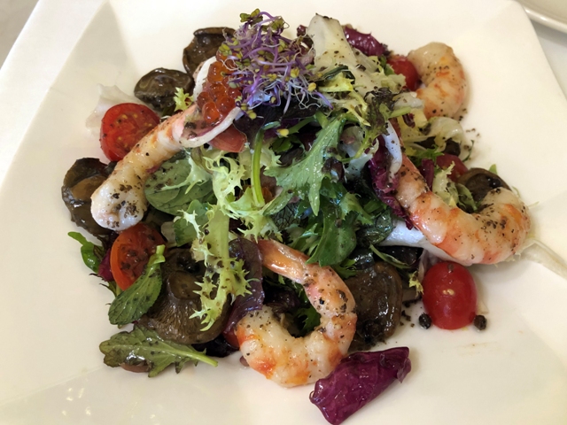 En nuestro caso elegimos de entrantes la Ensalada de gambas y alcachofas baby con bacón y queso, como podéis comprobar en la foto, las gambas eran frescas y de un buen tamaño y las alcachofas estaban deliciosas.
