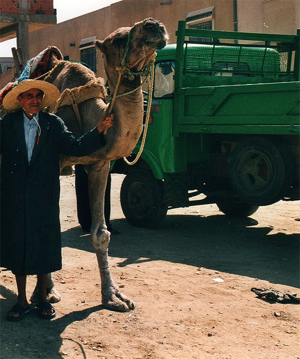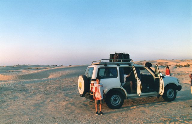 La última actividad del día era contemplar al puesta de sol montados en dromedarios, para ello nos dirigimos hacia Douz «puerta de entrada al Sahara«, a unas dos horas por carretera y desviándonos por unas pistas de tierra que atravesaban unas dunas, con la mala suerte que en un momento dado nuestro 4×4 se quedó atrapado en la arena, cuando por fin se liberó de la trampa de arena, nuestro conductor se perdió por las dunas, por lo que tuvimos que detenernos para que pudiera llamar por teléfono al convoy y lo orientaran correctamente, como os podéis imaginar vimos la puesta de sol perdidos en el desierto.