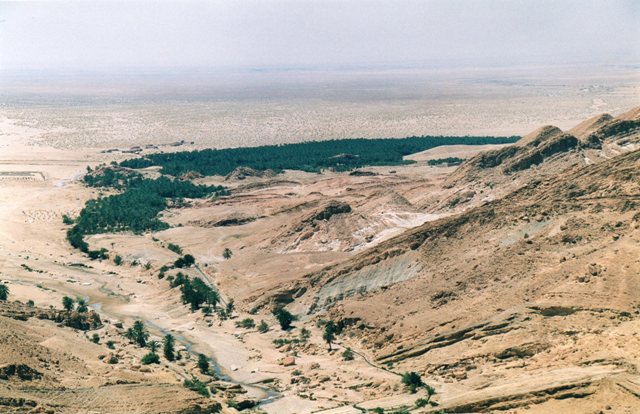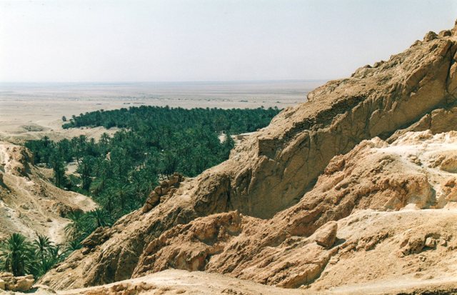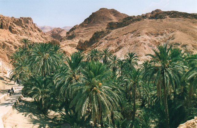 Tras atravesar el lago salado nos dirigimos hacia el oasis de montaña de Chebika, situado al pie de las montañas del Djebel el Negueb. Para poder llegar recorrimos un largo tramo por pistas de tierra que cruzaban una zona desértica hasta que de pronto aparecieron miles de palmeras, es sorprendente el cambio que hicimos tan radical, pasamos de una tierra completamente árida a otra repleta de palmeras, a pesar de ello hacia un calor horrible.