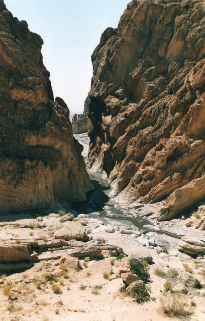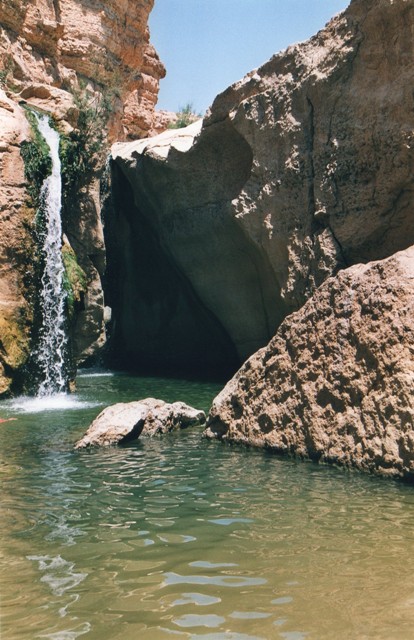 Una vez llegamos a la parte más alta por encima del pueblo, tuvimos unas excelentes vistas de todo el oasis, eso si, estábamos chorreando de sudor, incluso alguno de los viajeros se marearon por golpes de calor. Descendimos por unas escaleras que nos llevaron hasta el fondo de la garganta, junto a una pequeña cascada formada por el riachuelo, Uad Khanga, que es el que riega todo el gran palmeral.