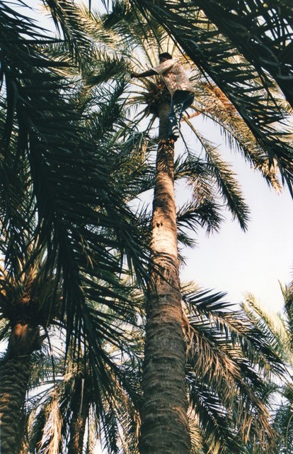 Al atardecer, cuando la temperatura había descendido un poco, hicimos un recorrido en calesa hasta la zona de los palmerales de Tozeur, donde pudimos visitar y degustar los cultivos de los famosos dátiles deglat en nur, haciéndonos una demostración de como escalan las palmeras para su recolección.