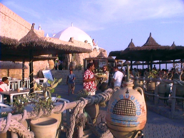 Regresamos a la ciudadela de Hammamet para pasear al atardecer, y cuando anochecía nos sentamos en un café para tomar un té chupando una cachimba.