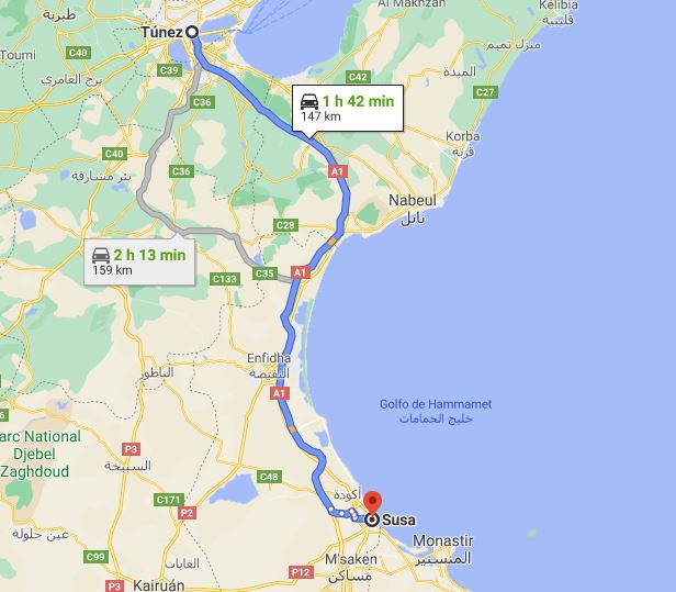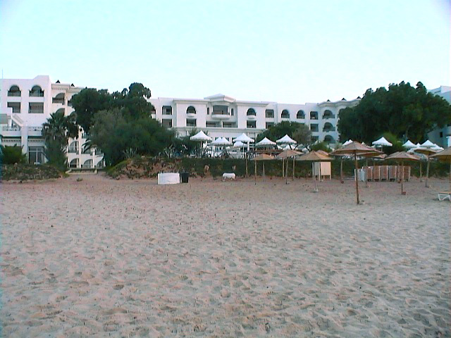 Una vez llegaron los viajeros madrileños, por fin nos pusimos en marcha hacia la ciudad de Sousse o Susa, que es donde teníamos reservado el hotel, un trayecto de más de dos horas, por lo que llegamos al hotel entre unas cosas y otras, pasadas las 12 de la noche, nos dieron para comer cuatro pica pica y a dormir. Encima nos dicen que al día siguiente hay que salir temprano, ¡¡ a las seis de la madrugada !!, total que apenas dormimos cuatro horas.