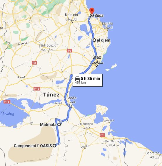 Una vez completada la visita del anfiteatro emprendimos la ruta hacia Matmata, situada cerca de la ciudad de Gabès, a unos 355 kilómetros de Sousse.